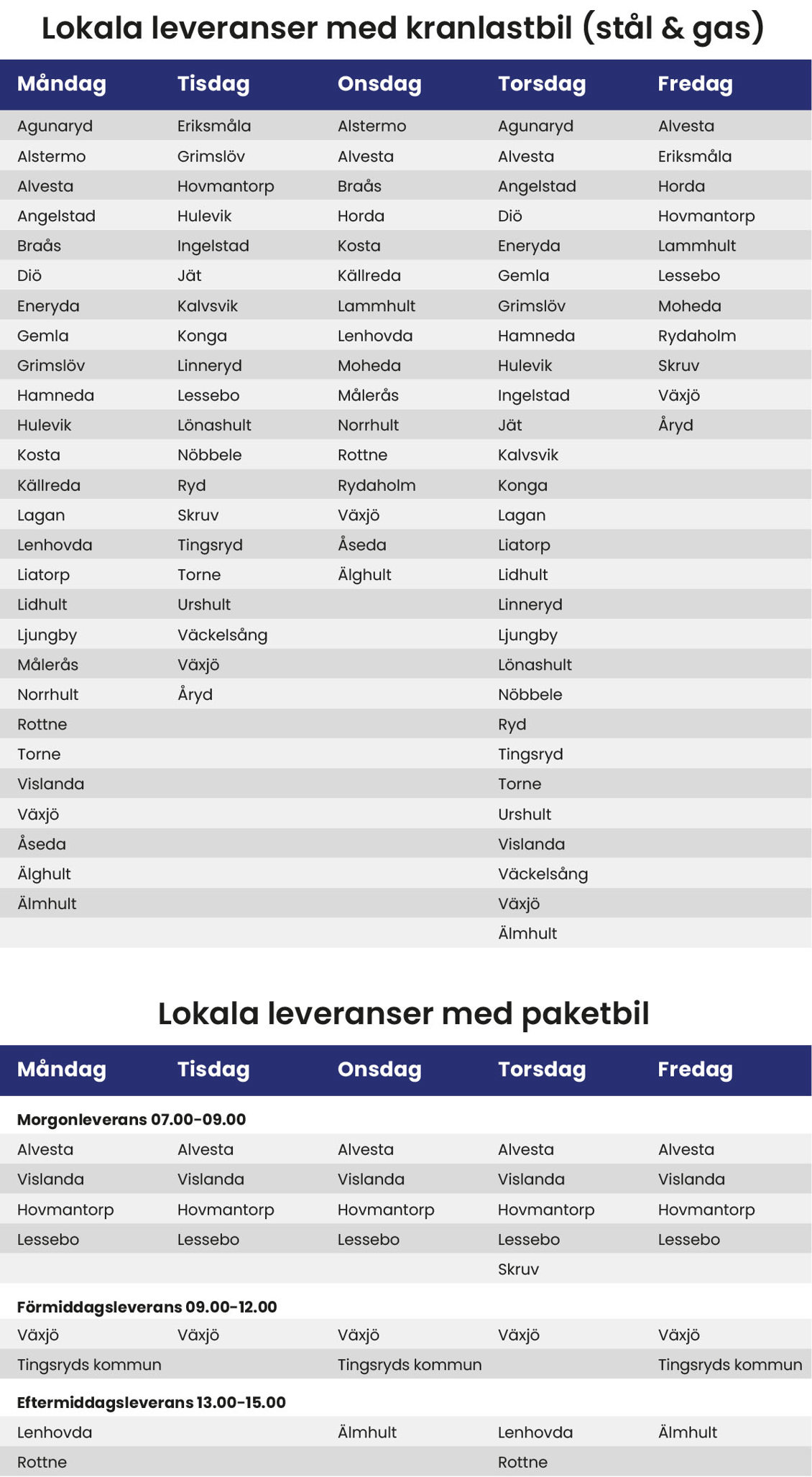 Med vårt centrala läge mitt i Småland har vi nära till våra kunder. Vi har egna turbilar som förser både små och stora arbetsplatser med förnödenheter, ibland flera gånger per dag. Vi har alltid fraktfria leveranser på vårt lagersortiment, det ingår i vår service!