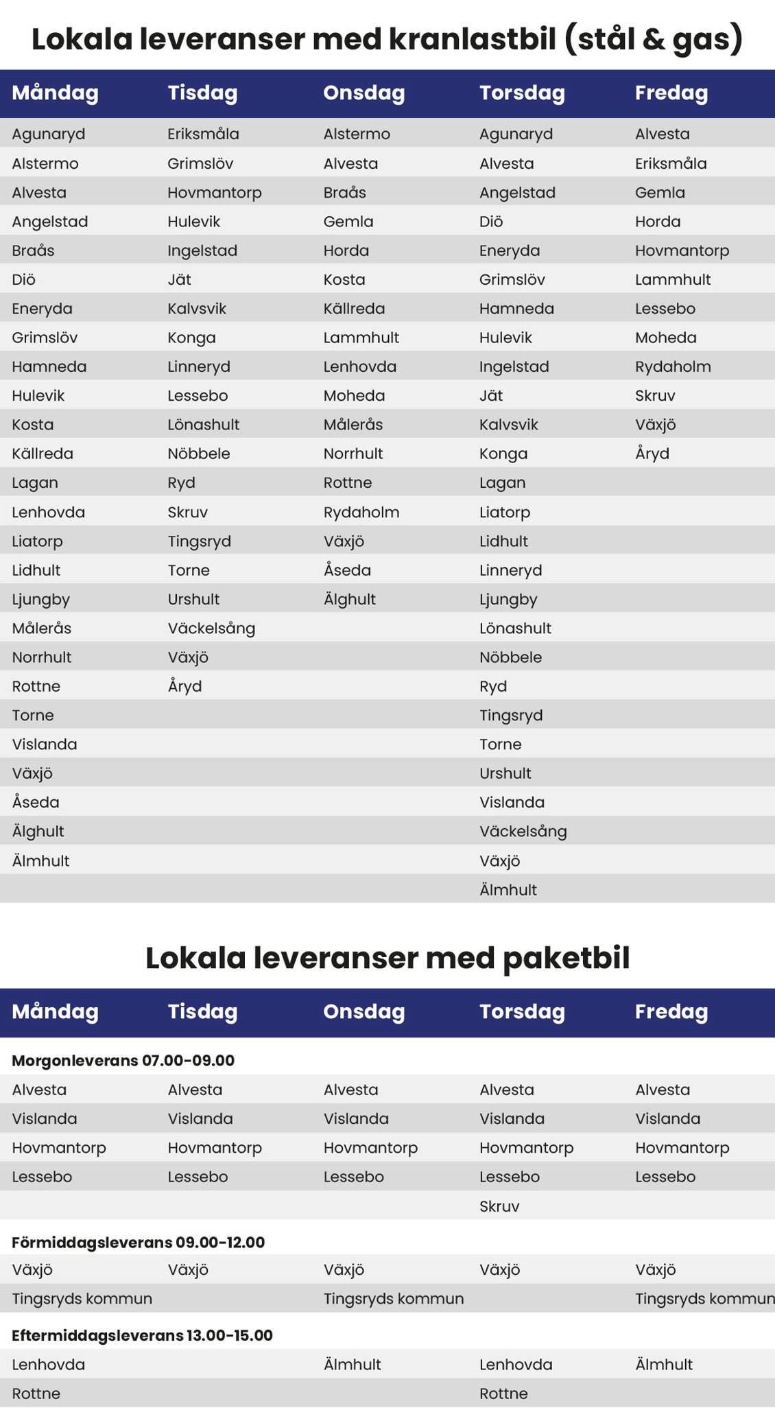 Med vårt centrala läge mitt i Småland har vi nära till våra kunder. Vi har egna turbilar som förser både små och stora arbetsplatser med förnödenheter, ibland flera gånger per dag. Vi har alltid fraktfria leveranser på vårt lagersortiment, det ingår i vår service!